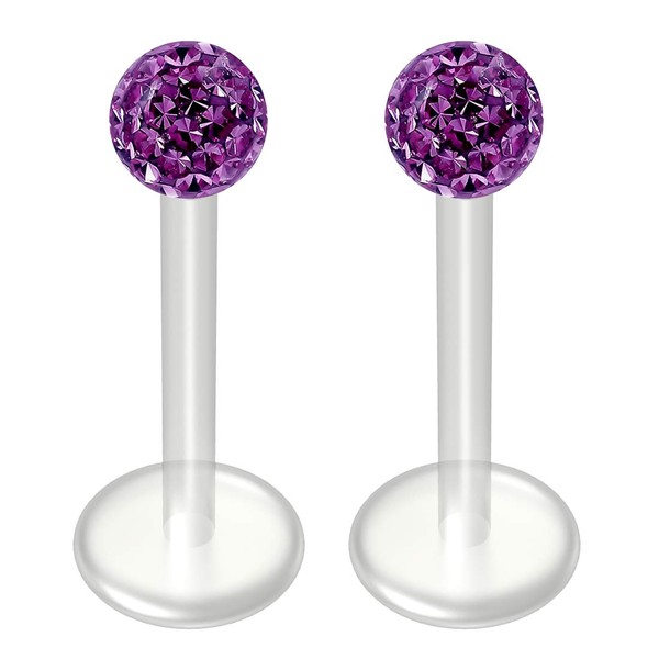 • SPECIFICATIONS - Crystal: 4 x Amethyst Crystal gems that sparkle, glitter and are cute and pretty (no fogginess). Length: 10mm. Gauge: 16g. Ball End: Crystal 3mm. These bioflex labret 16g are designed and tested for quality. Get the most out of your piercing with these bioplast labret 16g