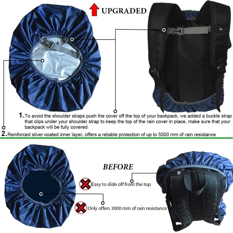 - Anti Slip Off Design: There are buckle straps and elastic rim to keep backpack cover secure on the pack . The convenient buckle straps at the top can help tighten and prevent the backpack cover from slipping off while the elastic attaches firmly on your backpack , never worry about your backpack cover blowing away in strong winds or being pushed off by shoulder straps.