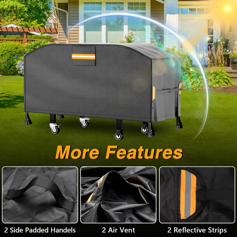 - 【More Features】①The two handles not only make it easy to put on or take off the cover, but are also very convenient for hooking when washing and drying; ②Two air vents keep air circulating inside and outside the hood, reducing condensation and preventing corrosion and mold; ③Two reflective strips not only add a colorful touch to the black grill cover, but also make it easy to identify the grill's location in the dark.2 Side Padded Handels