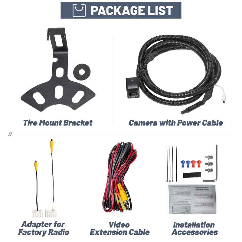 【Easy to install】 3 mounting options: mount at 12 o'clock, 1-2 o'clock or 6 o’clock. This backup camera kit provides a small ring gasket to help keep the tire from tilting.