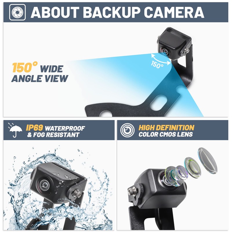 【IP69 Waterproof & Night Vision】IP69 waterproof hard shell prevents splashing water, dust and sand from damaging backup camera. Built-in CMOS presents stable and HD daytime and nighttime images, no worry about parking during night, rainy day or in dark garage. Work well in extreme weather and complex scenarios and weather conditions.