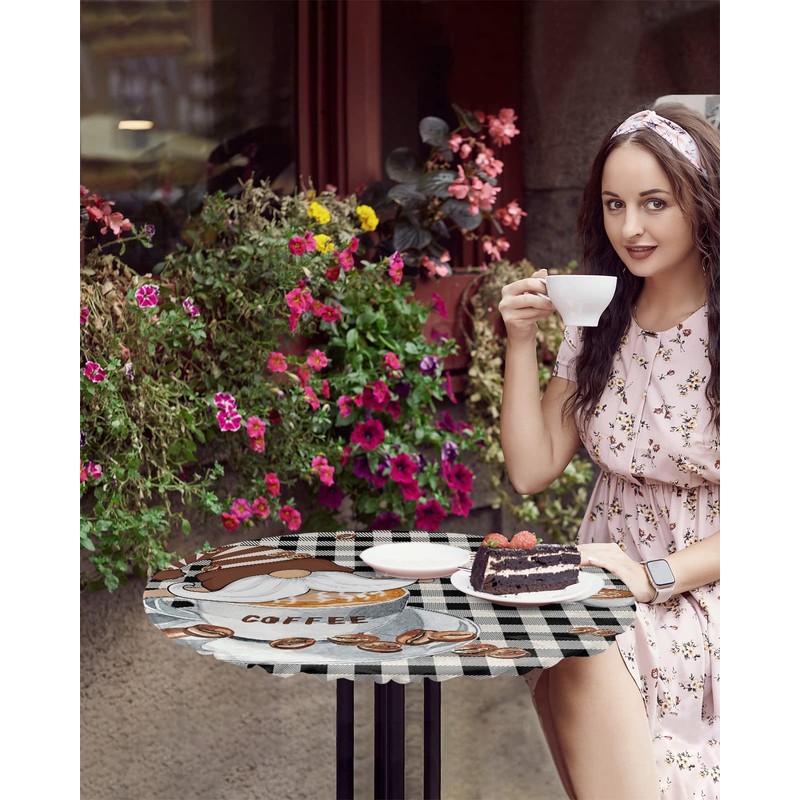 EwdeWwo Coffee Gnome Elastic Round Tablecloth, Funny Gnomes on Cup Black Plaid Border Fitted Tablecloths for Round Table Oil-Proof Waterproof Table Cloth (Fit for 45" - 54" Round Tables)