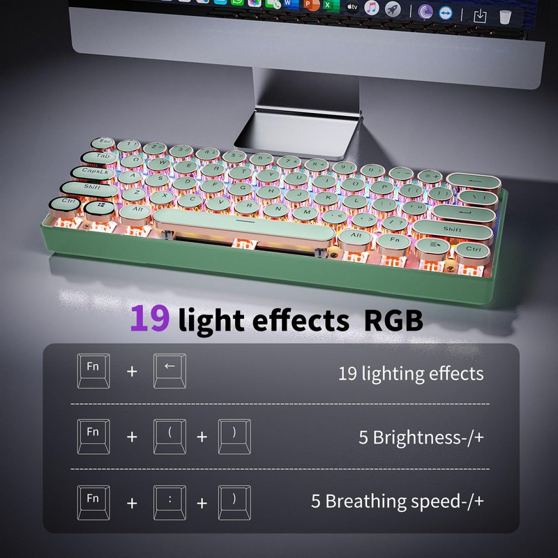 - Retro Typewriter Style Round Keycaps: G61 wireless typewriter keyboard uses double-shot injection retro punk round keycap with clear backlight, extremely durable and characters do not fade. Stepped floating keycaps that fit your fingertips perfectly, precise position. Ergonomic foot support makes typing less tiring and more comfortable. Highly-durable mechanical red switch responds faster. The sound is smaller and quieter. Suitable for: office/game/dormitory/cafe/travel.