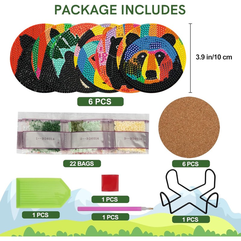 Unleash Your Creativity Package Contents: 6 x Coasters 6 x Cork Pads 1 x Diamond Bag Set 1 x Diamond Painting Pen 1 x Diamond Tray 1 x Glue Clay