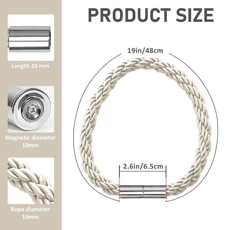 - Dimension - 2 pcs magnetic curtain tiebacks in package. The total length of our magnetic curtain tape is 21.7"/55cm and the rope width is 0.55"/1.4cm, it can be twisted and you can adjust it according to your requirements