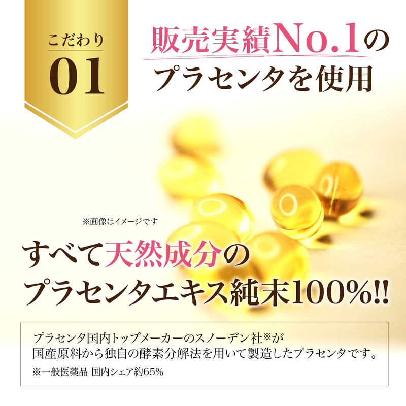 - 【天然成分の高品質プラセンタ】プラセンタ国内トップメーカーのスノーデン社が、国産原料から独自の酵素分解法を用いて製造した全て天然成分のプラセンタエキス純末を100%使用。水分と不純物を取り除いた濃縮された粉末が1カプセルで170mg配合しています。スノーデン社の中でも最高ランクのプラセンタエキス純末を是非ともご体感ください。