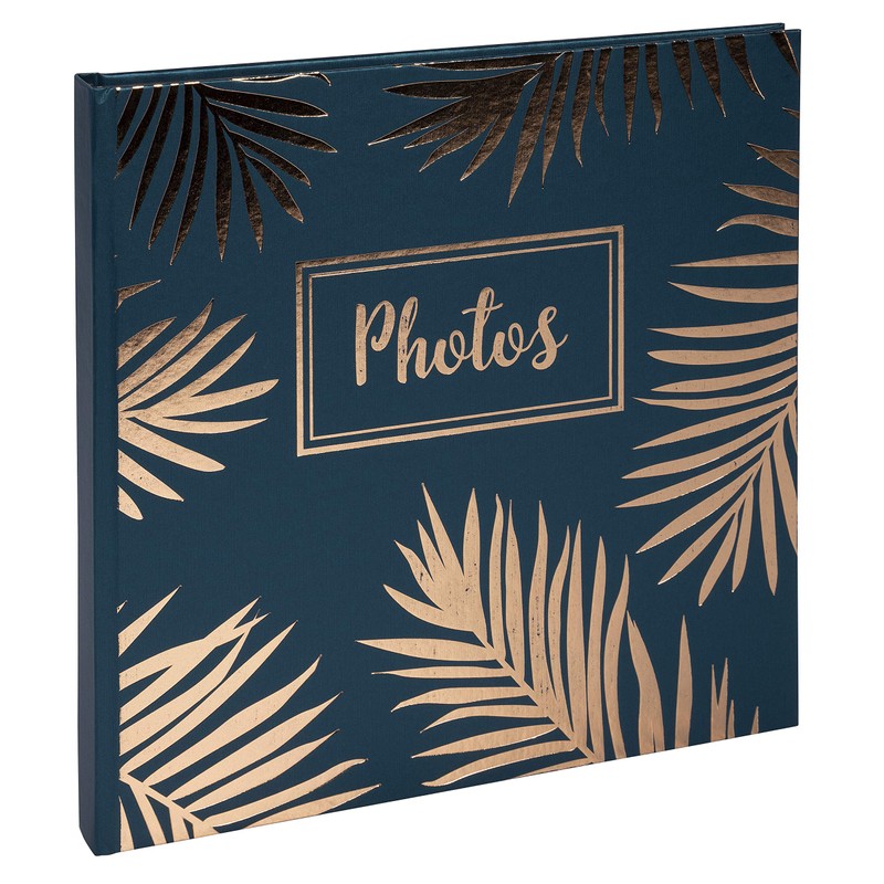 - Thick blue cover with a trendy rose gold marking and palm leaf motif with the word 'Photos' in the middle of the page