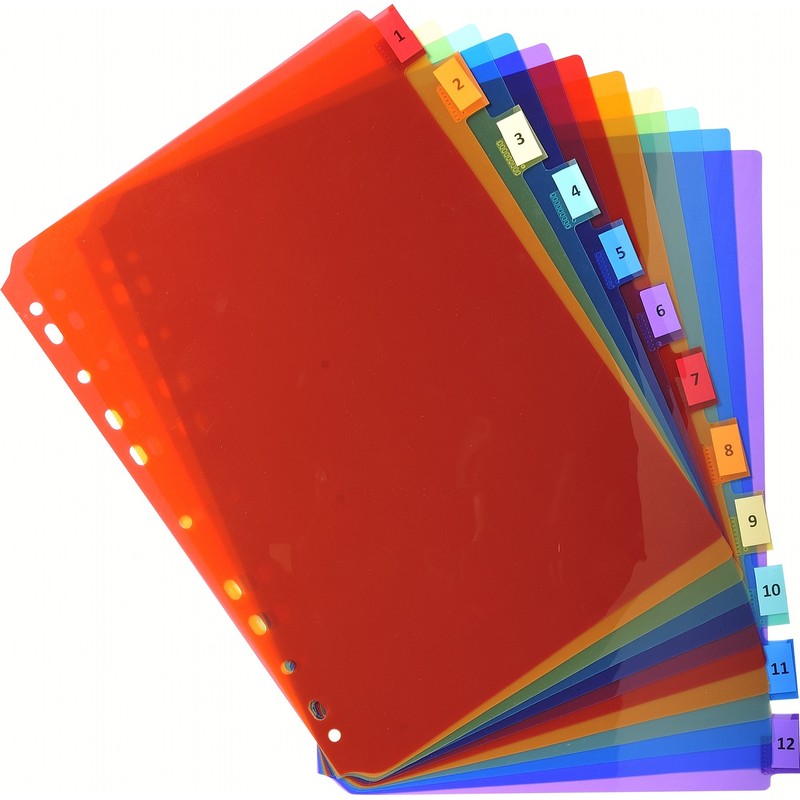 Exacompta - Ref 3912E - PP Document Dividers - Suitable for Use With A4 Documents, Made from Polypropylene, Pre-Punched & Pre-Printed - 12 Part Dividers - Multicoloured