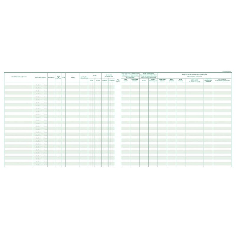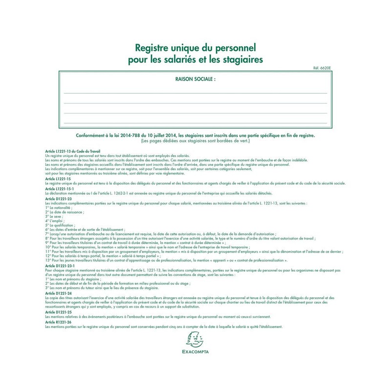 Exacompta - Ref 6620E - Horizontal Single Register of Personnel (Employees and Trainees) Record Book (52 Pages) - 110gsm Paper with Green Rulings - French Text