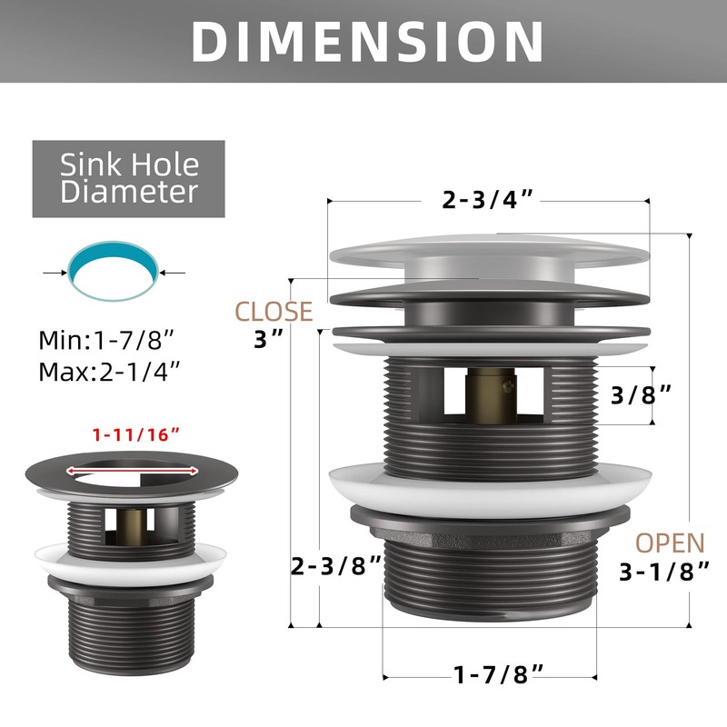 Dimension: The EXAKEY freestanding tub drain features a diameter of 2-3/4 inches,pop-up open height 3-1/8 inches,closed height 3 inches.This grey tub drain has a thread diameter of 1-7/8 inches,fitting NPSM bathtub waste drain joint.Premium Quality: This free standing tub drain is made of high-quality brass mechanism and pop-up bolt. The matte black finish provides a protective plating layer, ensuring the pop-up bathtub drain is durability, solidity, and rust-resistant for long-lasting performance.Watertight Design: This pop up drain kit for freestanding bathtub features a watertight design with silicone gasket seals for effective water proofing,no glue required.The matte grey tub drain includes a removable anti-clogging basket and a flange with two drain holes for overflow water,ensuring smooth and clog-free drainage.Easy To Use: This freestanding bathtub drain features a user-friendly,replaceable assembly designed for convenience.The gray soaking tub drain catcher allows for easy operation,simply push to open for water drainage,using either your hand or toe, and push again to close for storage.Installation & Support: For optimal results,we highly recommend installing this freestanding soaker tub drain kit with our durable,waterproof silicone gasket seals.If you have any questions or need support regarding the EXAKEY stand alone bathtub drain, please feel free to contact us.