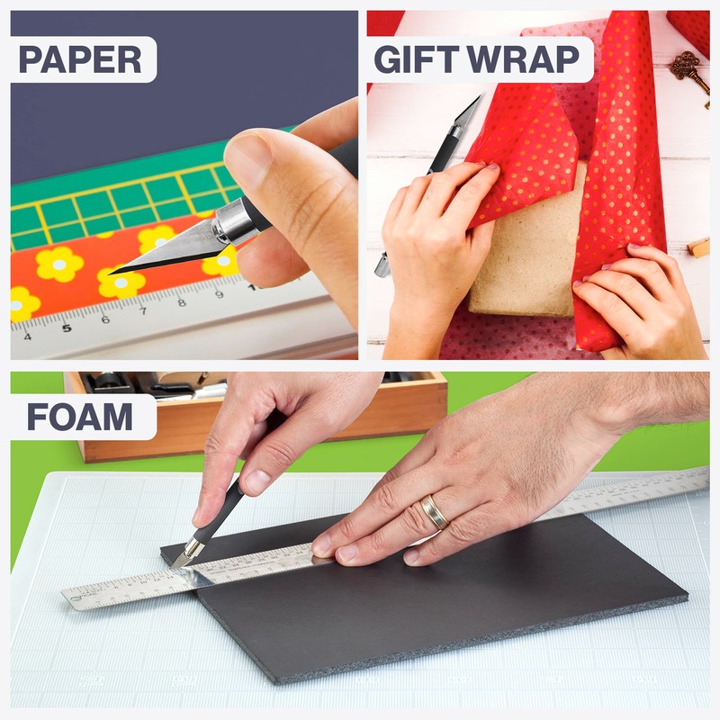 Our ergonomic knife is crafted with a lightweight yet durable aluminum body and a soft grip rubberized handle for optimal comfort. Perfect for detailed work, it cuts and trims with precision and ease, creating curves and fine details without putting unnecessary strain on your hands. The anti-roll hex shape and specialized four-jaw screw provides extra safety and stability during use, while the shatter-proof protective cap keeps it safe during storage. Our reusable knife set is compatible with a wide variety of replacement blades, providing long-lasting quality and exceptional value. From stripping paper and box cutting to carving clay and pumpkins, it is the perfect tool to keep on hand.