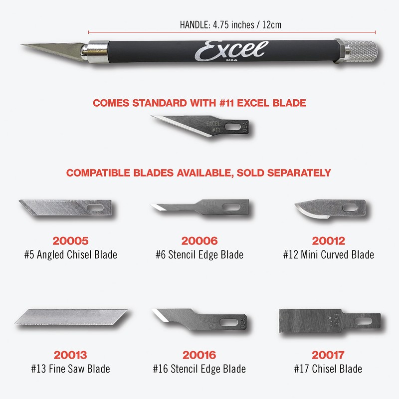 Whether you're looking for the perfect tool for scrapbooking, model kits, or art projects, Excel Blades Soft Grip Craft Knife Set is perfect for all your needs. Equipped to handle even the most intricate details, this versatile set is ideal for a wide variety of crafting and design projects. The strong, sharp blade tip can won’t break easily and easily cuts lightweight materials like vinyl, masking film, paper, plastic, wood, cloth, decals, foam board, cardstock, rubber, cardboard, styrofoam, and more. From beginners to skilled craftsmen, this fine-point, No.11 double-honed blade produces careful and meticulous cuts with incredible consistency.