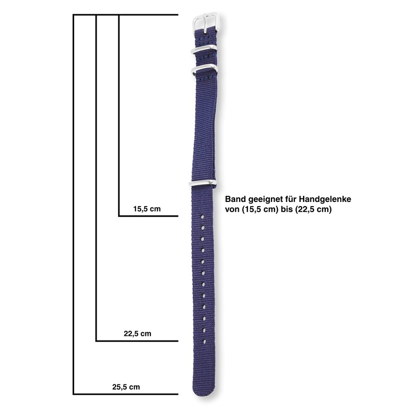 Gender unisex length 25.5 cm stylish fashionable material nylon colour dark blue buckle strap type basic material top nylon material bottom nylon first loop sewn length hole part 15 cm length buckle part 10.5 cm strap thickness 3 mm clasp material metal clasp material metal clasp colour silver coloured.