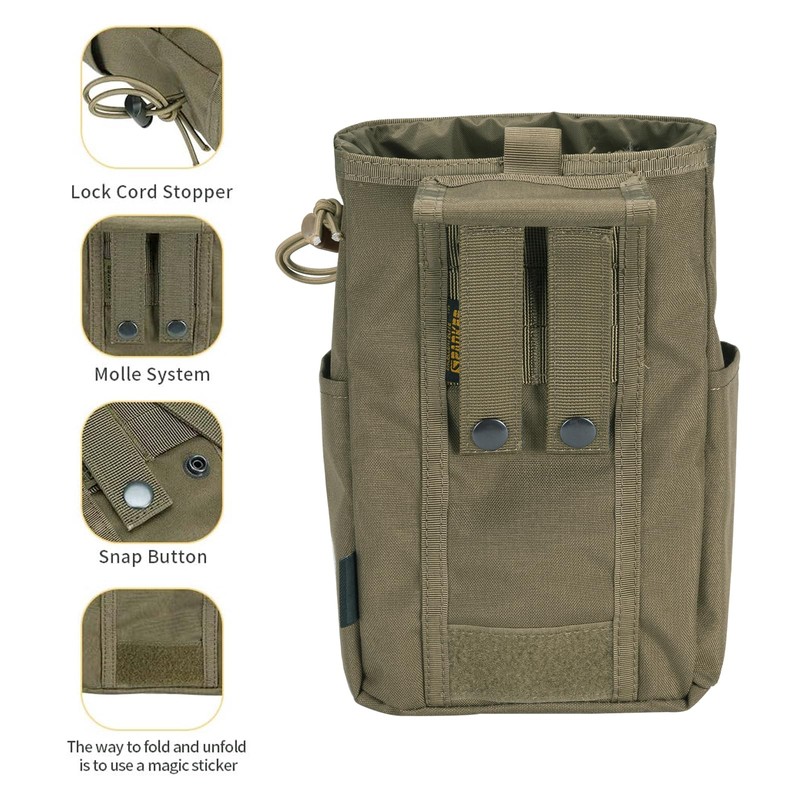 EXCELLENT ELITE SPANKER Molle dump pouch foldable bag with drawstring tools. Size: 6 x 3 x 8.5 inches (length, width, high). Size of the internal package: 3.7 inches x 1.2 inches x 5.3 inches (length, width, high). Colours: black, brown, grey, olive green, multicam, multicam black