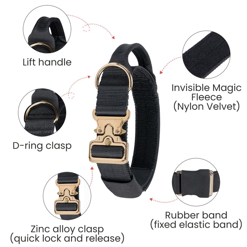 - This nylon dog collar is made of high-quality nylon fabric and a metal buckle with a quick release. The collar with handle makes it easier to control your dog with the handle.