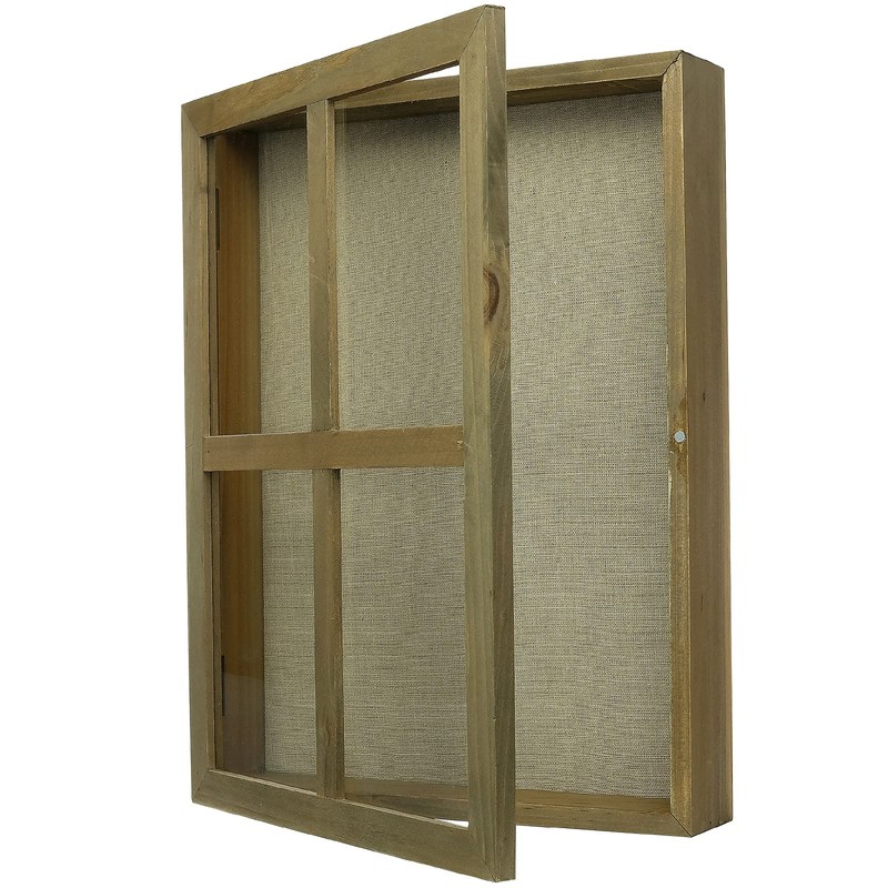 This 4-pane memory shadow box is made from solid wood with a rich natural brown finish that will fantastic in any home or office. Displaying photos and memories has never been more stylish and fun! Our shadowbox include 32 pushpins; 8 silver, 8 gold, 8 wood, and 8 acrylic. Our rustic memory shadow box comes ready to hang with two pre-installed metal mounting brackets.