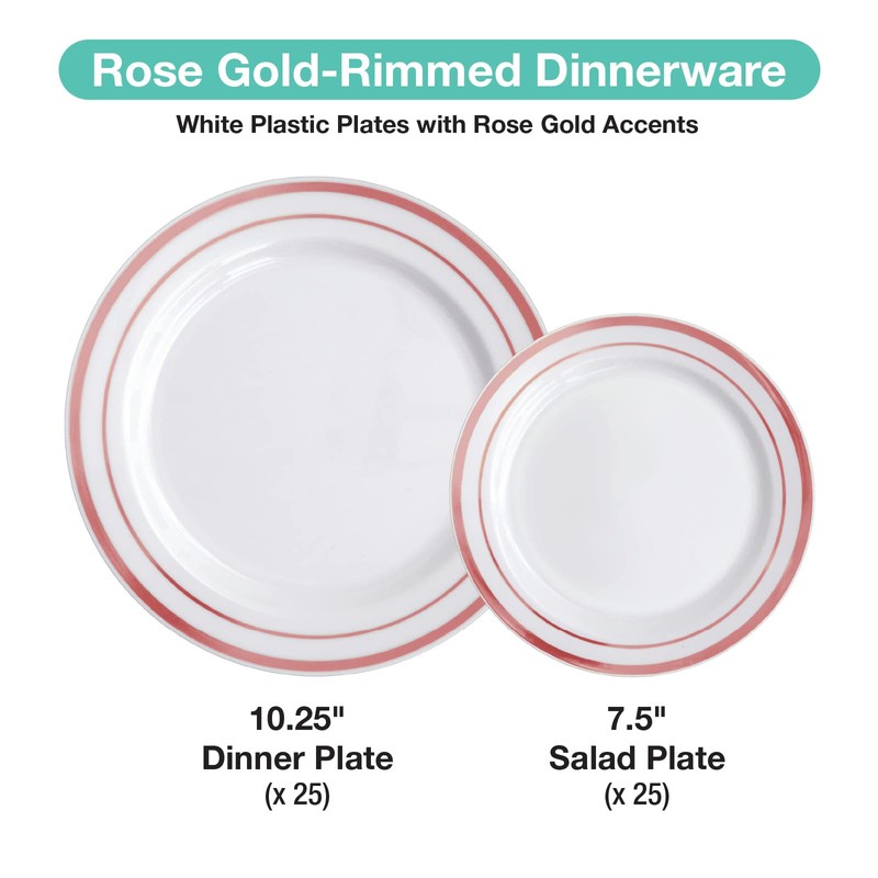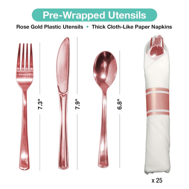 EXCELLO GLOBAL PRODUCTS Pre Wrapped Cutlery Set- 25 sets of Fork, Knife, Spoon wrapped in a napkin - 25 Small Plates- 25 Big Plates (Rose Gold)