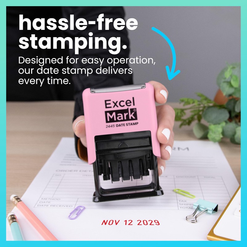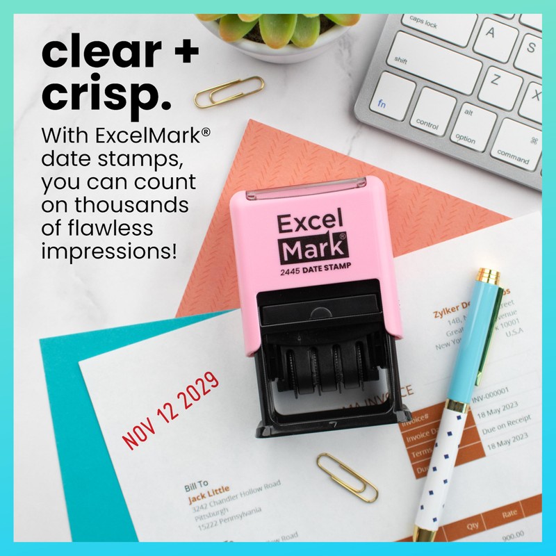 ExcelMark 2445 Date Stamp – Perfect for Shipping, Receiving, Expiration and Due Dates (Red Ink, Pink Mount)
