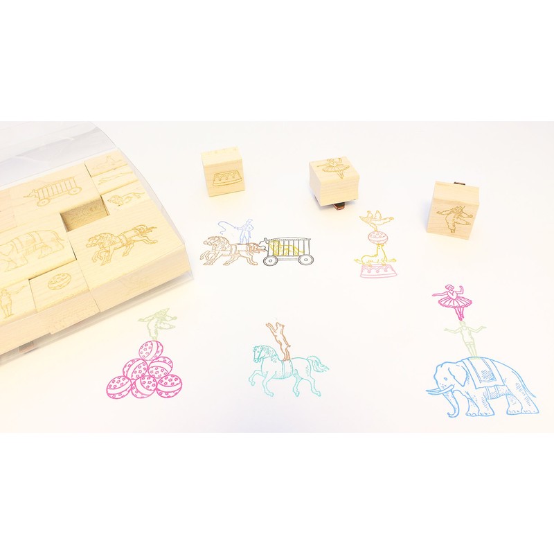 - 13-piece stamp set includes: elephant (2" x 2"), carriage (2" x 2"), podium (1" x 1"), ball (1" x 1"), horse (2" x 2"), double horse (2" x 2"), acrobat (1" x 1"), ballerina (1" x 1"), clown (1" x 1"), seal (1" x 1"), lion (1" x 1"), lion tamer (1" x 1"), and dog (1" x 1")