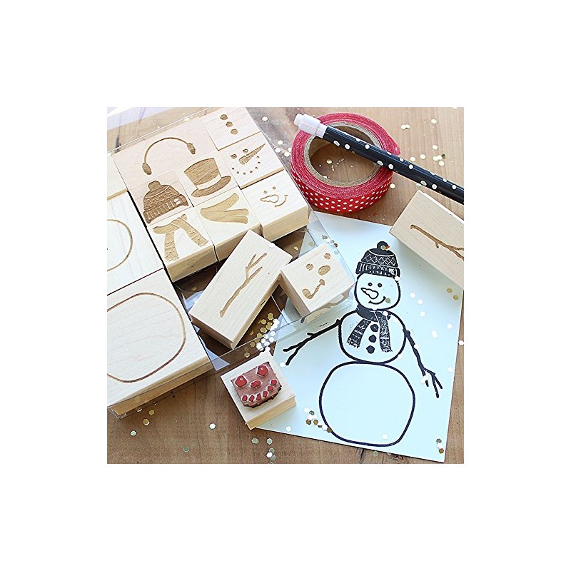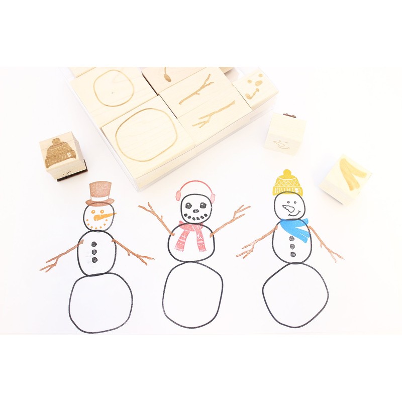 Build a variety of different personalized snowmen with this rubber stamp set! A combination of 15 different stamp designs supplies endless creativity -- and is perfect for a day inside with the kids! Each stamp features a maple wood mount, laser-engraved with its design. An acetate plastic box provides simple storage and transport, as well as allows you to see the stamps easily.