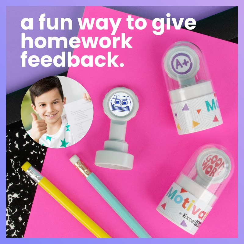 ExcelMark Teacher Stamps for Classroom – Choose from 5 Colors (Robot Smiley Face)