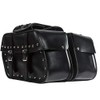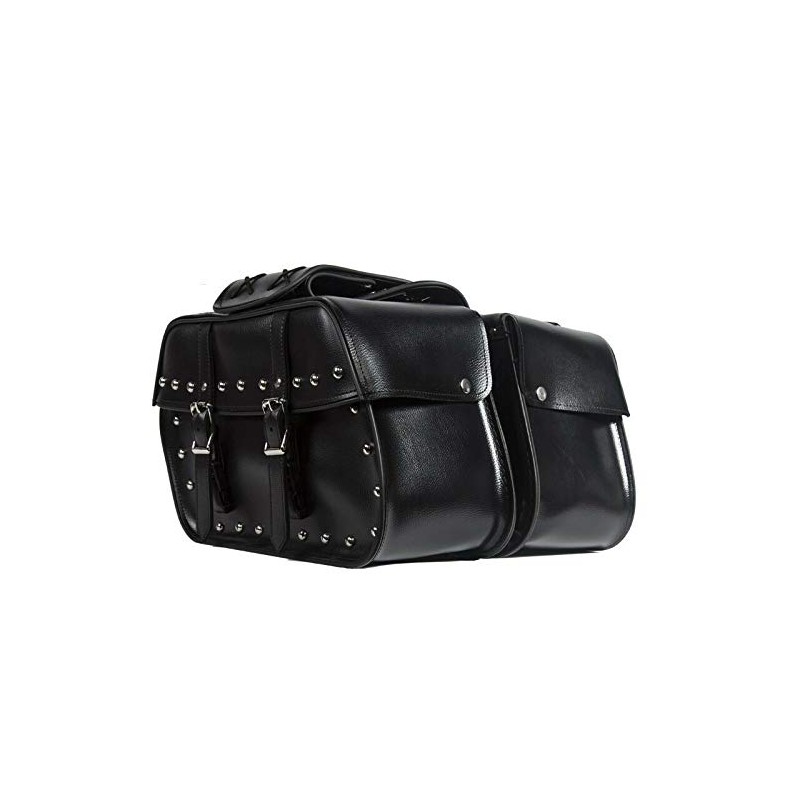 Premium Quality Heavy Duty Motorcycle Travel Luggage Saddle Bag. Motorcycle Saddlebags w/ Studs Leather Like Heavy Duty PVC Metal Clips for easy removal of bags Hidden Handles for easy carrying Quick Release under Straps/Buckle 2 Tie Down On Each bag Hard Sheet inside to hold its shape.