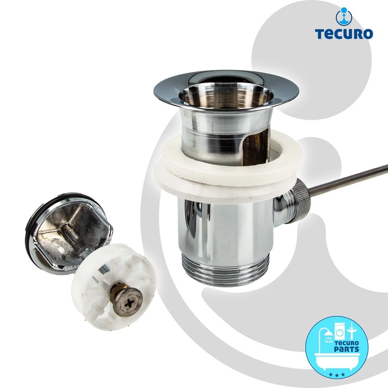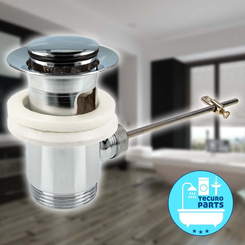 tecuro Eccentric drain and overflow set for washbasins with overflow. Design: high-gloss chrome-plated connection down: 1 1/4 inch, suitable for all conventional siphons and odour traps. Includes joint piece for mounting the pull rod. Outlet: diameter 63 mm. Plug: diameter 40 mm. Material: brass. Material plug: metal. Base with height-adjustable screw and hair strainer made of plastic. The eccentric drain fitting is suitable for use. with all conventional Siphand odour traps. The brass set has a 1 1/4 inch connection downwards and comes with a joint piece for mounting the pull rod. The plug has a hair strainer can be adjusted in height via a screw.