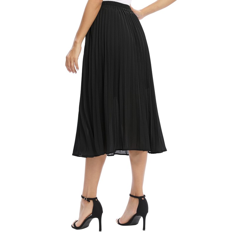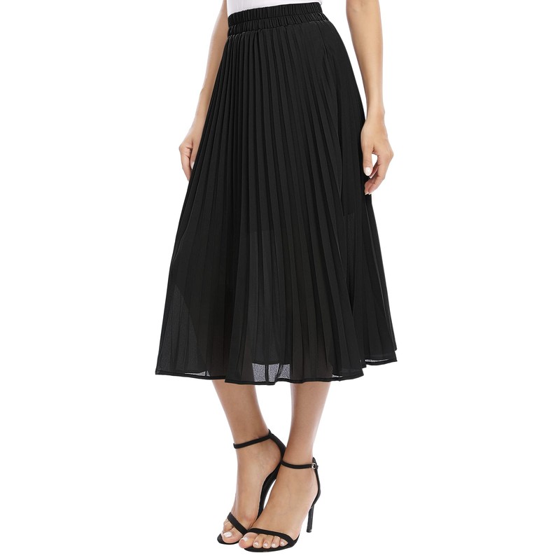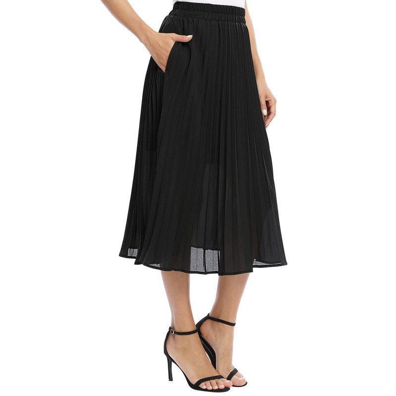 EXCHIC Women's Casual Chiffon Elastic Waist One Line Pleated Midi Skirt with Pocket, black