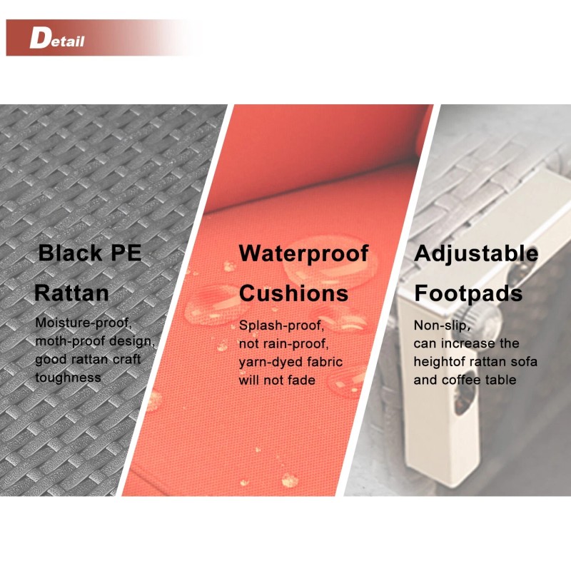 Crafted with weather-resistant PE rattan and powder-coated steel, the armless chairs are sturdy to ensure long-term outdoor usage. And the frame of sofa set is stable and won’t deform with large load capacity.