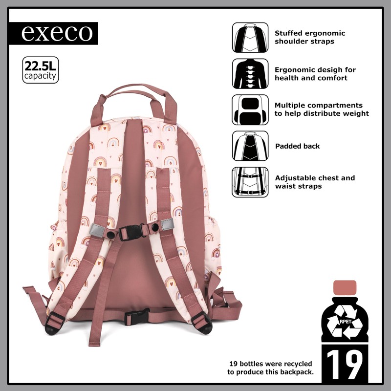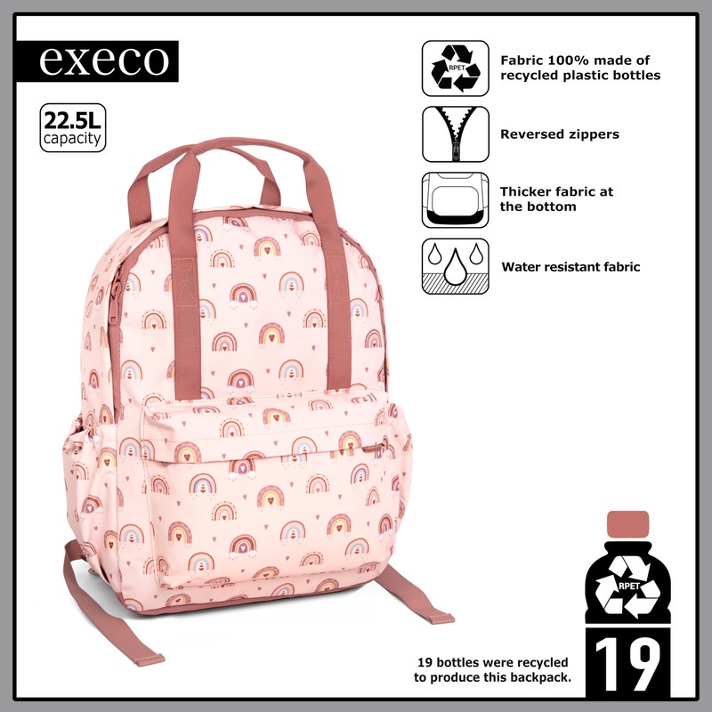 Execo Designer 3-PCS Bundle Kids Backpack, Lunch Box and Pencil Case for Preschool and Elementary, Eco-Friendly RPET Fabric Made from Plastic Bottles, Reflective Safety Bands (Rainbow)