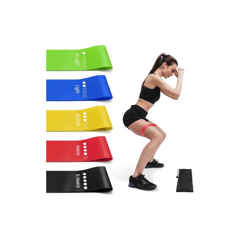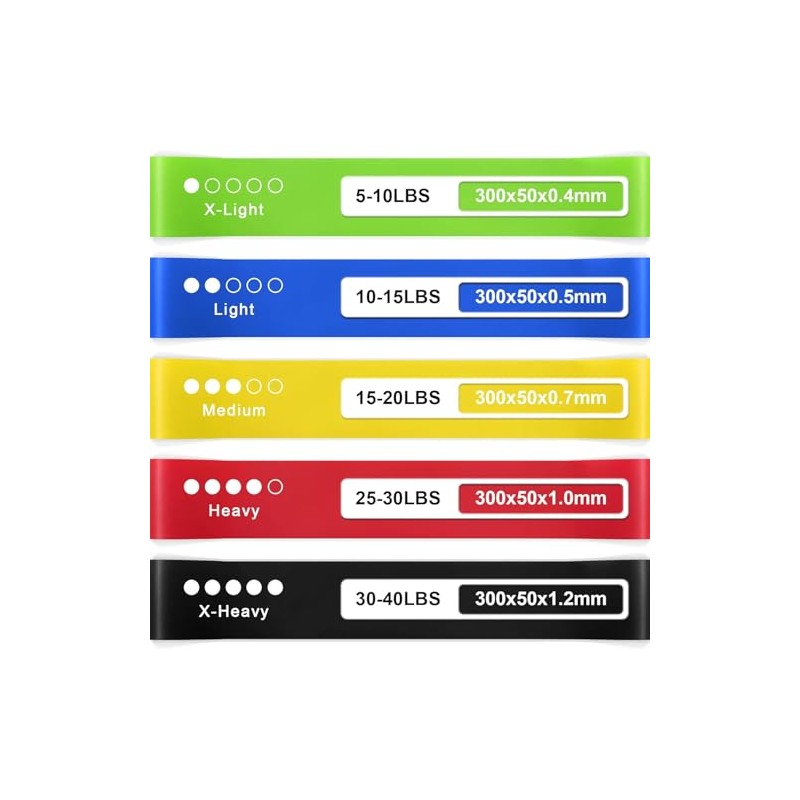 - RESISTANCE LEVELS: Set includes 5 color-coded bands with varying resistance levels from x-light to x-heavy for progressive workout intensity
