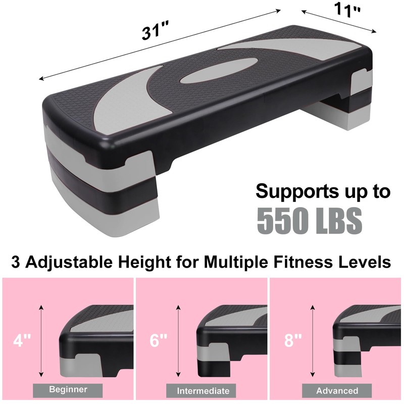 • 【Three Adjustable Height】Adjustable stepper comes with 31"(L) x 11"(W) x 4"(H) platform and 4 risers. Intensify workout difficulty by adjusting platform height from 4" to 6" to 8" using risers to challenge yourself. Perfect for people of all ages and fitness levels.