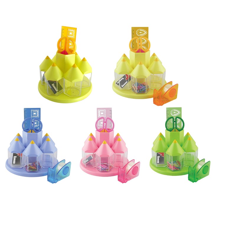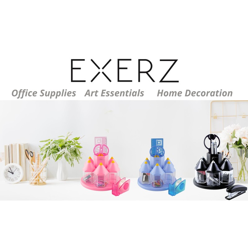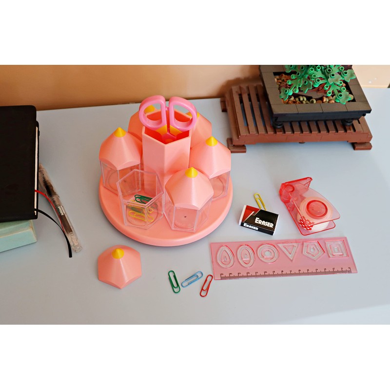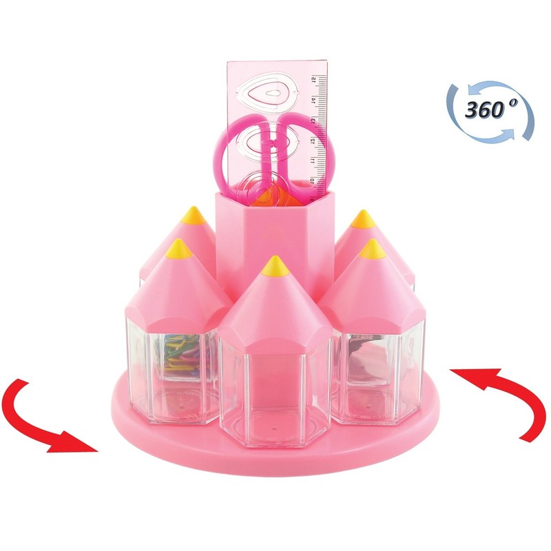 EXERZ Rotary Desk Organiser Pen Tidy Set with 5 Accessory Boxes -with Safety Scissors (NOT Sharp), Ruler, Tape Dispenser, Eraser, Clips (Pink)
