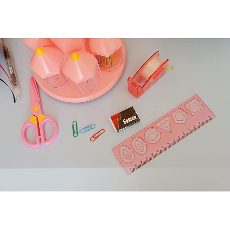- Filled with three in one ruler x 1, safety scissors (Not Sharp - Plastic scissors) x 1, tape dispenser x 1, color paper clips x 1 bag (40 pcs), eraser x 1