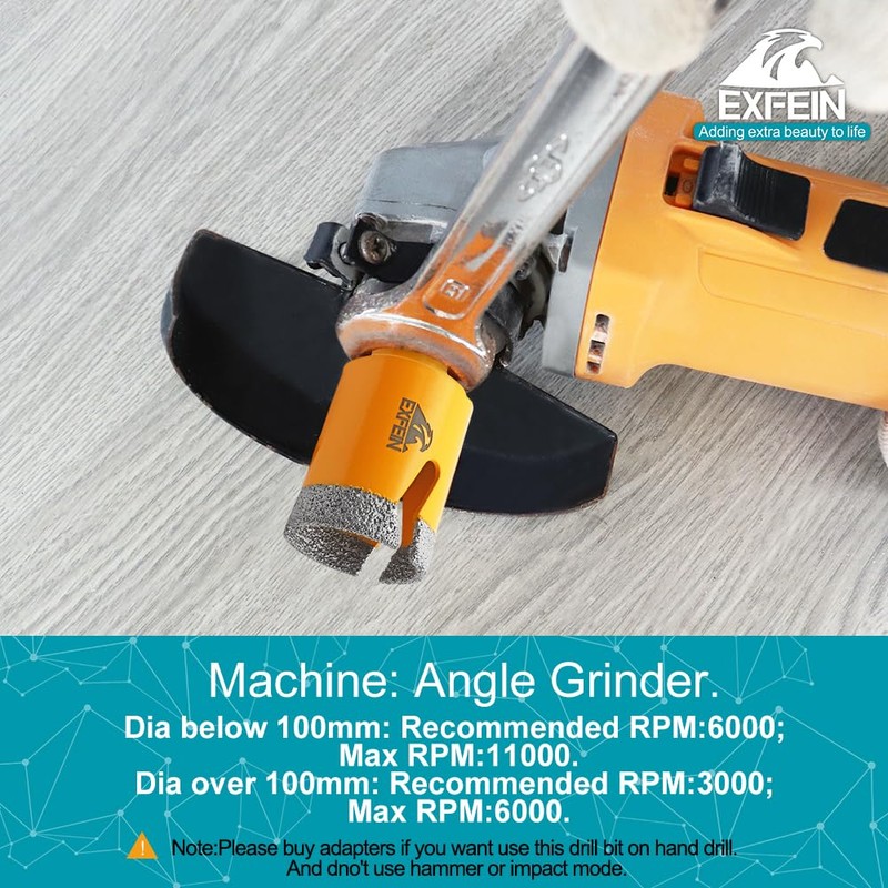 - 【Machine】5/8" arbor angle grinder. If you are using this bit on a hand drill, you need an adapter and make sure that the drilling speed does not go below 2000RPM. And do not use the impact drill mode.