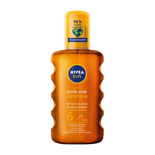 - Box contents: Nivea Sun carrot solar oil spray, FP6, waterproof for a beautiful and healthy tanning, 1 x 200 ml spray.