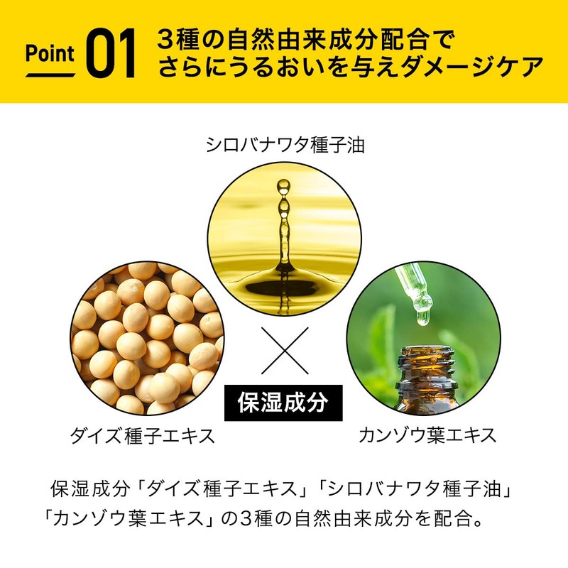 - [Product Features] A treatment that further moisturizes and protects damage care: Dye seed extract that cares for damage caused by 5 types of UV rays, hair color, dry, heat, and friction. *Contains 3 natural ingredients, including terrible banana trapezer seed oil**, celeptic leaf extract