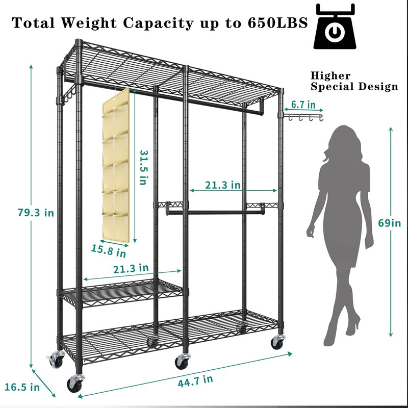- 【Well-Organized Clothes Rack】 Freestanding clothes rack is with dimension 44.7''L x 16.5''W x 78”H/ 113.6x42x201 cm (Overall with wheels), each hanging rod max load 22lbs, each shelf can rod to 66lbs, the whole garment rack load capacity up to 650 lbs. It ensures you enough space to place your hanging dress, shirts, pants, bath towel and extra laundry sundries with ease