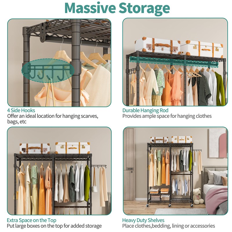 - 【360° Movable & Lockable Wheels】Garment rack equipped with 6 rolling wheels, 2 of them are locking wheels, designed to allow you to roll this clothing garment rack where ever you want