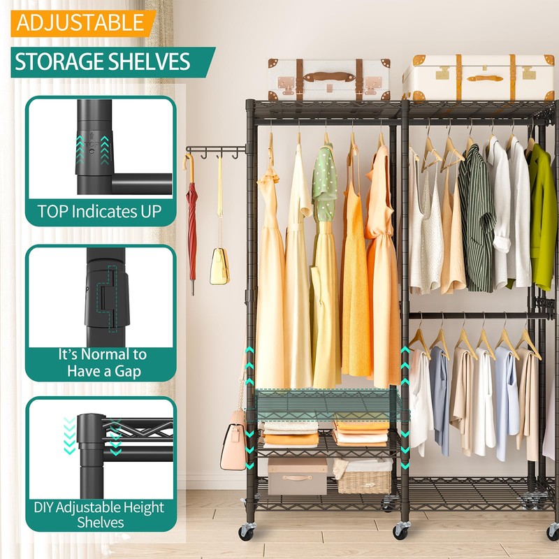 - 【Multi-Functional & Adjustable Garment Rack】This medium clothes storage rack can be used at anywhere you need, like entry closet, laundry room, hallway, balcony, bedroom, cloakroom, bathroom and more. The shelves can be adjusted up and down for your needs to store difference sized items
