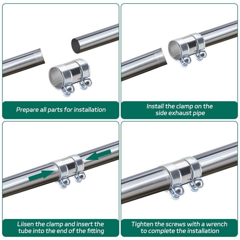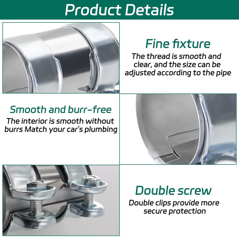 - Double safety: stainless steel exhaust clamp is equipped with double screws that ensure excellent sealing and high clamping forces, prevent exhaust gases and noise deposits for a long time and allow a secure connection of the exhaust pipe even at high speeds or under complex road conditions.