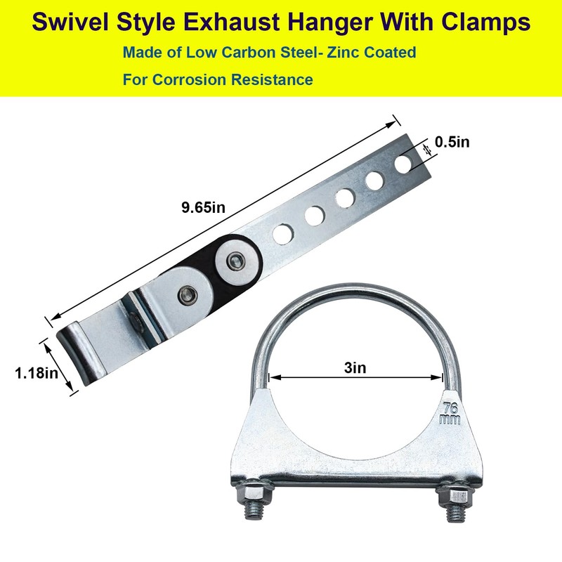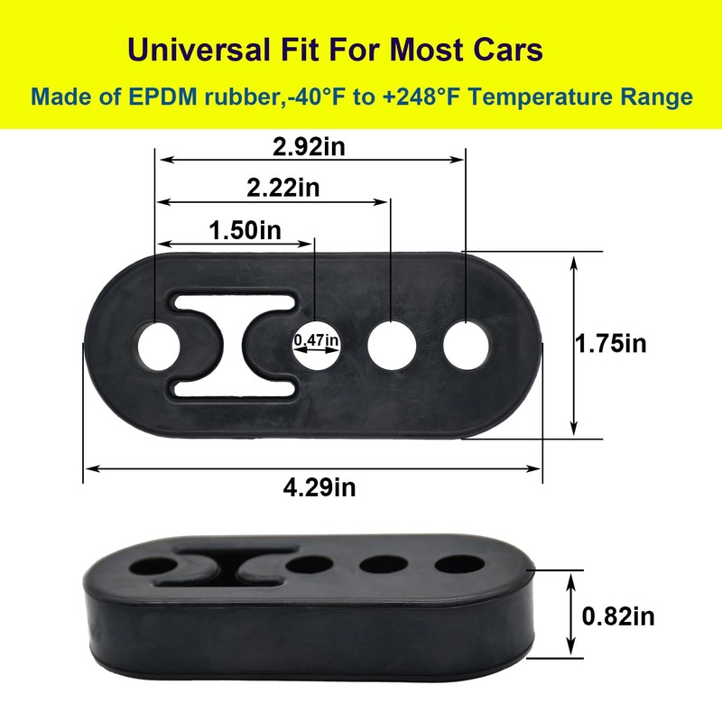 - [Universal Sizes]✔️4 holes Rubber Exhaust Hanger, 4.29inch×1.75inch×0.9inch. Hole Diameter:0.47inch,2 holes Rubber Exhaust Hanger,2.88inch×1.85inch×0.82inch.Hole Diameter:0.47inch.Hole Center Distance:1.49inch.90 Degree Bent Exhaust Hanger Rods is 9.5" long and thickness is 0.38 inch.Swivel Style Exhaust Hanger is 9.65 x 1.35 x 1 inches,The Clamps'Hole Diameter is 3 inch.