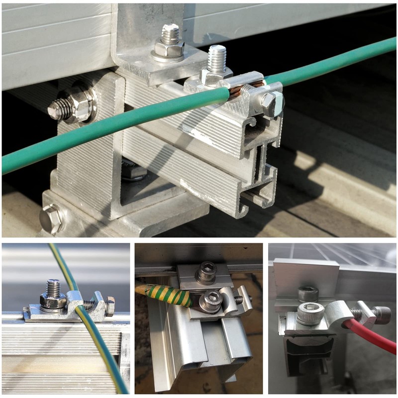 The earth clamp is a grounding element for lightning protection. The grounding lug connects the PV module to the ground copper wire. The grounding tab collects static electricity from the PV module and PV stand and directs it to the ground via the grounding copper wire. Protects the solar panel and extends its service life.