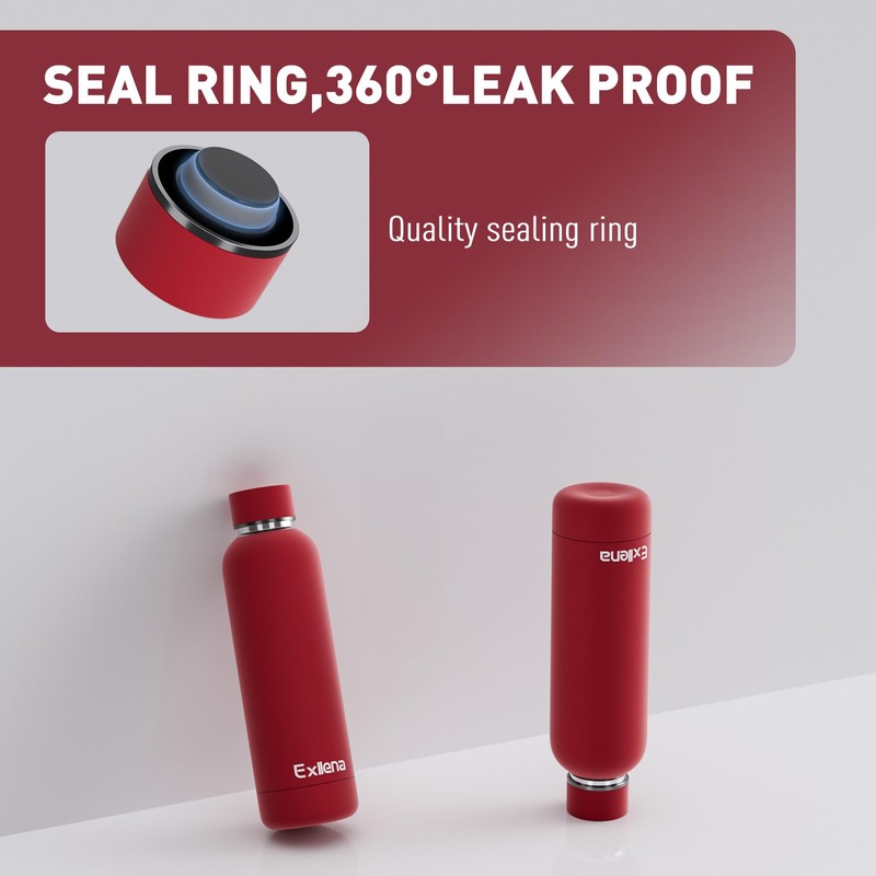 Exllena Slim Insulated Water Bottles for Travel 18oz with Clip, Double Wall Vacuum Stainless Steel Water Bottle Keeps Drinks Cold 24 Hrs/Hot 12 Hrs, 100% Leakproof, BPA Free(Red)