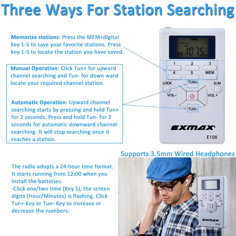 EXMAX E108 Wireless FM Radio Receiver Portable DSP Stereo Pocket Mini FM Radio Receiver Digital Samll FM Radio Earbuds LCD Clock for FM Translator Tour Guide System FM Transmitter Work - White