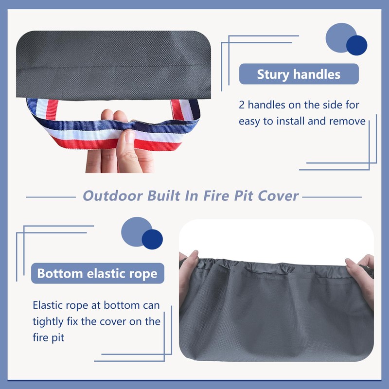 - 【Easy to use and fits perfectly】:Elastic hem cord at bottom of our built in firepit covers can make the cover fix closely with the fire pit,provide a perfect fit.4 sandbags can help weigh the cover down,just fill with weights to some kind,like rocks or stone or sand,it can keep the wind from blowing the cover off.And 2 strong handles on the side make it easy to install and remove