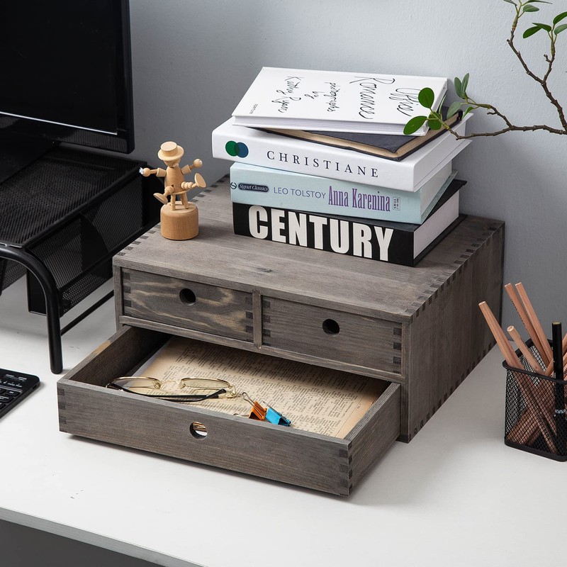 Crafted from high-quality wood with a charming stone-gray finish, this rustic-style wooden desktop cabinet holder fits in every corner of your home and matches rustic, industrial, urban, and many other styles of decors. Place one on your vanity top to sort cosmetics, skincare products, jewelry items, and accessories. Also use this organizer to hold keys, smaller tools, stationery, and various other random items in your living room, kitchen, bathroom, or hallway. The top shelf space even provides an excellent way for you to display photos, potted plants, and other smaller decors.