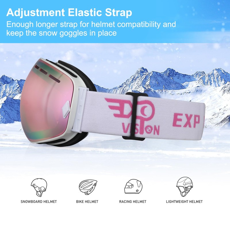- Universal Compatibility Ski Goggle For Helmet: Fast adjustable elastic strap can be suitalbe for all size helmet. The soft arc shaped foam of snow goggles is for maximum facial comfort.