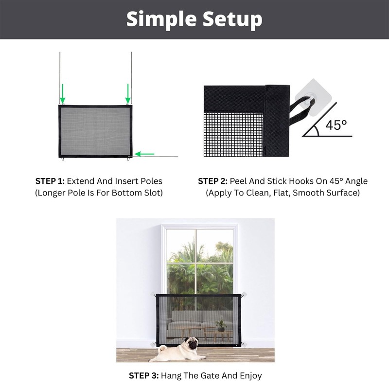 • 2. Easy Assembly: Our pet mesh gate is effortless to install, disassemble, and store. It's designed to be portable, so you can easily fold it and take it anywhere - perfect for vacations or visits to family and friends. The overall design emphasizes practicality and space-saving capabilities, making it an excellent addition to any home.