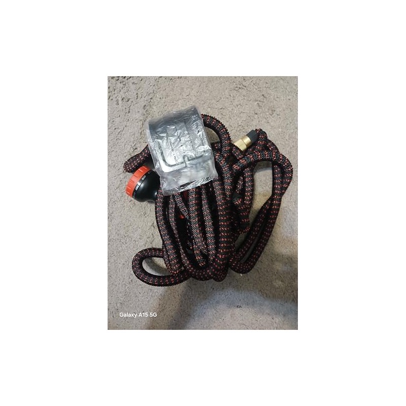 Transform your gardening experience with this innovative 50-foot expandable garden hose that makes watering tasks effortless and storage a breeze. The hose features a durable black outer layer that protects the inner core, while its expandable design allows it to stretch to full length during use and contract for compact storage. Included is a versatile 10-pattern spray nozzle that lets you customize your water flow for different tasks - from gentle misting for delicate plants to powerful jet streams for cleaning. The package comes complete with a convenient storage bag to keep your hose organized and protected when not in use, plus a holder for easy mounting. The lightweight design and flexible nature make it easy to maneuver around garden obstacles, while solid brass fittings ensure leak-free connections. When the work is done, simply drain the water, and watch as the hose automatically contracts to a fraction of its extended length, fitting neatly into the provided storage bag.